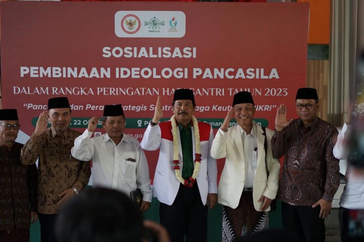Badan Pembinaan Ideologi Pancasila (BPIP) memberikan sosialisasi tentang Pancasila kepada para santri Pondok Pesantren Pandanaran, Kabupaten Sleman, Daerah Istimewa Yogyakarta, guna memperkuat ideologi Pancasila mereka agar …